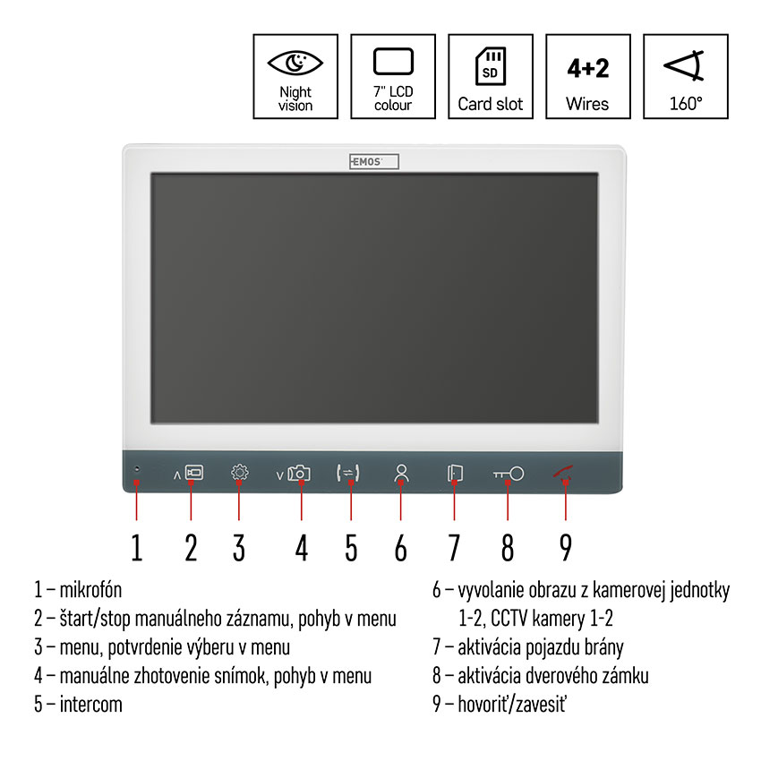 Video telefón EMOS EM-10AHD vám zjednoduší život v mnohých ohľadoch. Nielen že vás upozorní na prichádzajúcu návštevu a umožní obojstrannú hlasovú komunikáciu, ale aj stlačením jediného tlačidla na vnútornom LCD monitore v okamihu odomkne vstupné dvere alebo otvorí garážové vráta či bránu. A bude sa vám hodiť, aj keď práve nebudete doma. Ak vás príde totiž niekto navštíviť, môže vám na záznamníku nechať zvukový aj obrazový odkaz.