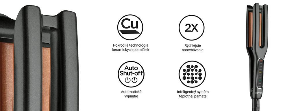 Vynikajúci rovnomerný prenos tepla zabezpečujú štyri, 12mm široké, medené keramické plochy. Práve vďaka nim má žehlička ultra hladký sklz vďaka čomu dochádza k dvakrát rýchlejšiemu narovnaniu vlasov jedným ťahom. Žehlička si poradí aj s väčším prameňom vlasov, čo znižuje počet opakovaní žehlenia a chráni vaše vlasy pred poškodením vplyvom tepla. Zabudnite na krepovatenie vlasov! S touto žehličkou nebude mať šancu. Na LED displeji si môžete vybrať jednu z 10 možných teplotných nastavení, až do 235°C. REVLON DOUBLE STRAIGHT si poradí s každým typom vlasov. A určite vás poteší aj funkcia tepelnej pamäti, ktorá prispeje k rýchlejšiemu stylingu, pretože už nebudete strácať čas opätovným nastavovaním teploty.