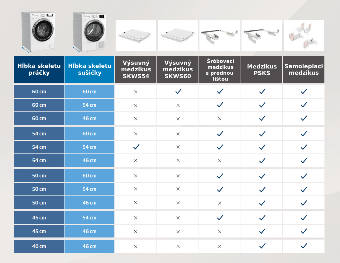 Pre práčky a sušičky Beko s rozdielom hĺbky skeletu maximálne 10 cm.