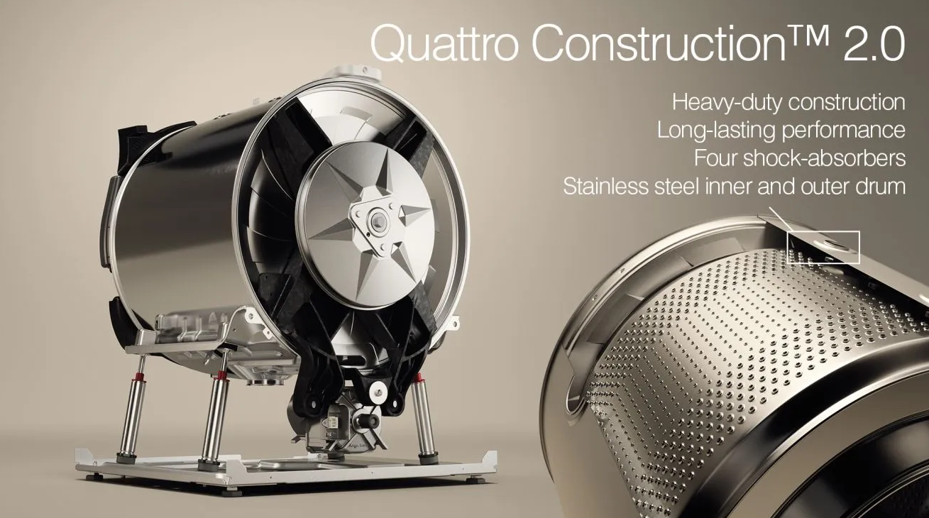 Quattro Construction™ 2.0 od ASKO výrazne znižuje hluk a vibrácie počas prania aj odstreďovania. Štyri tlmiče prenášajú vibrácie z bubna na základovú dosku, čím minimalizujú veľké pohyby a znižujú opotrebenie. Medzi ďalšie prvky patrí zosilnená oceľová základová doska, robustný liatinový držiak motora a motorizovaný zámok dverí.