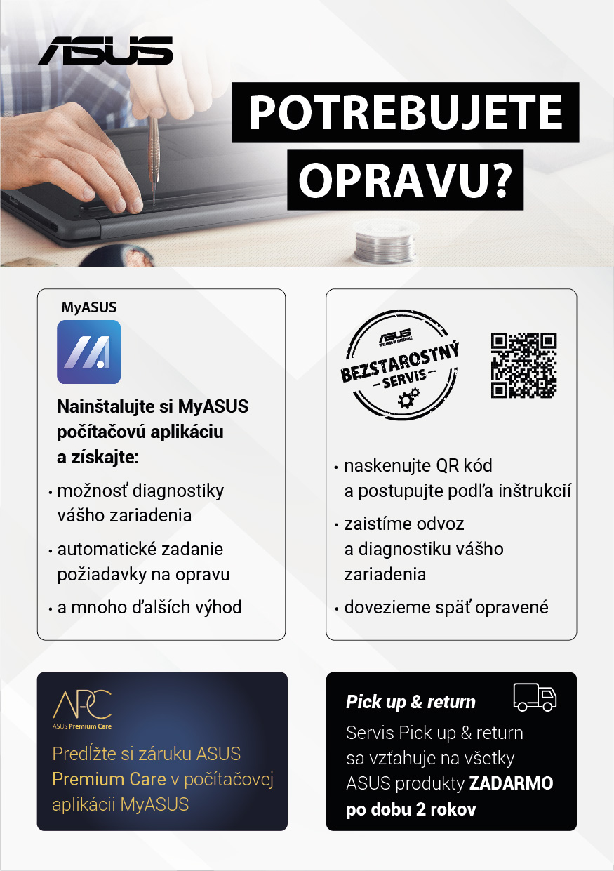 Vďaka službe Pick up and Return vyšleme kuriéra pred vaše dvere, ten tovar prevezme a po opravení vráti späť ku vám domov. Vy neplatíte ani cent, ASUS hradí všetky náklady na dopravu.