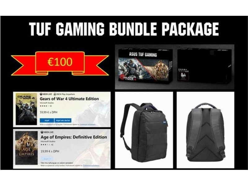 Súčasťou balenia je aj Gaming bundle v hodnote 100€ pozostávajúci z 2 hier vo forme kupónov pre Microsoft Store a Asus ruksak.