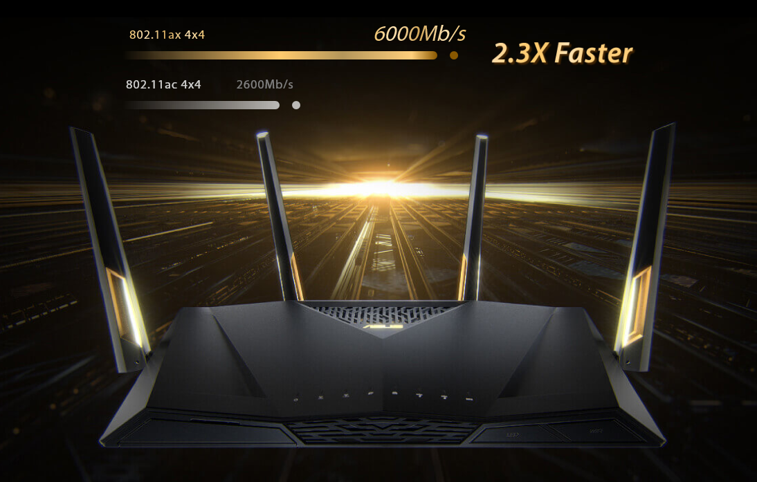 RT-AX88U je dvojpásmový 4x4 Wi-Fi router, ktorý poskytuje šírku pásma 160MHz a 1024-QAM pre dramaticky rýchlejšie bezdrôtové pripojenie. S celkovou rýchlosťou siete okolo 6000Mb/s - 1148Mb/s na pásme 2,4GHz a 4804Mb/s v pásme 5GHz je RT-AX88U 2,3x rýchlejší než router s dvoma pásmami 802.11ac 4x4.