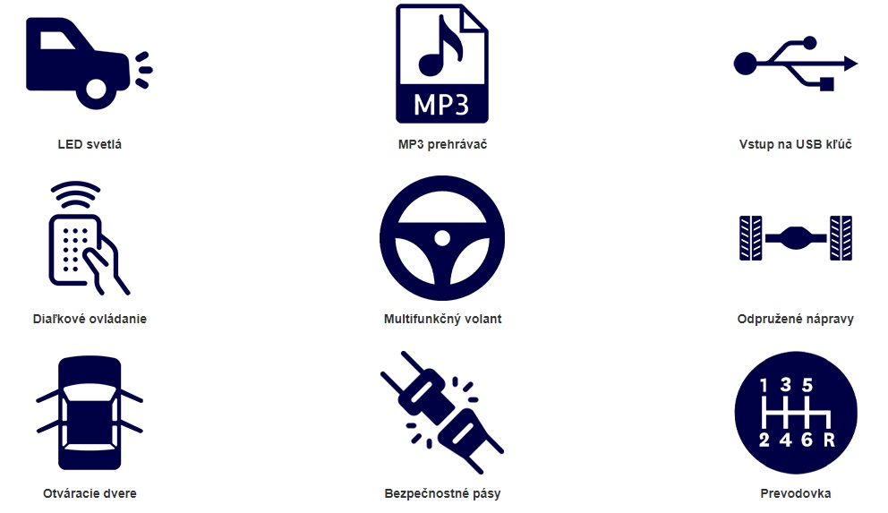 Autíčko je taktiež vybavené svietiacimi svetlami. Inovovaná audio jednotka s modernou muzikou so vstupom USB. Pre bezpečnosť dieťaťa je na sedačke nastaviteľný bezpečnostný pás.
