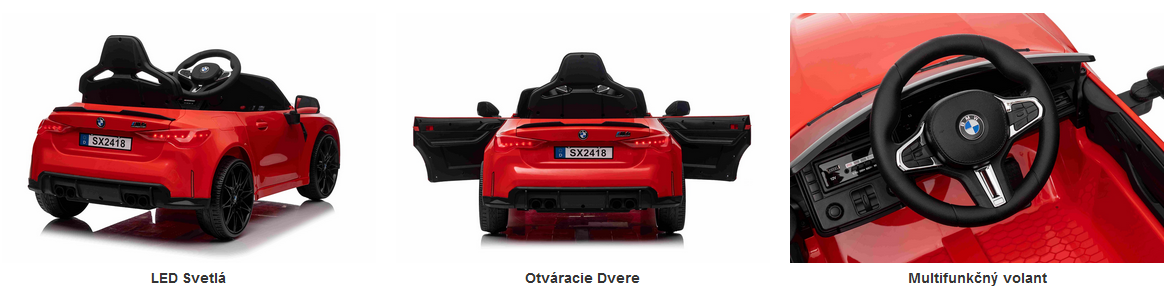Popis produktu BENEO BMW M4, červené, 2,4 GHz dialkové ovládanie, USB / Aux Vstup, odpruženie, 12V batéria, LED Sve
