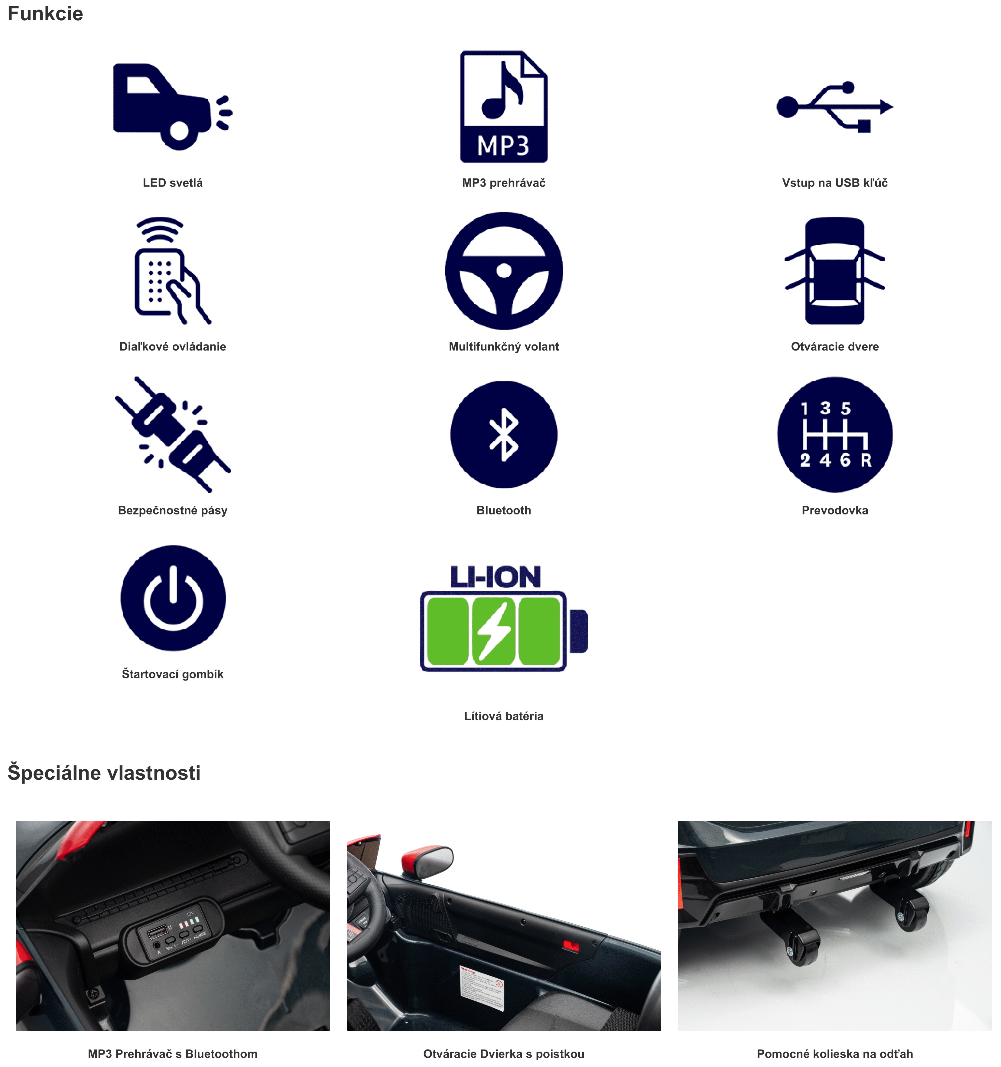 Autíčko má 2,4 GHz diaľkové ovládanie novej generácie, osvetlený vypínač a núdzovú brzdu, ktorá pri stlačení okamžite deaktivuje všetky funkcie vozidla. Auto má pohon oboch zadných kolies. Obsahuje prepínač nízka/vysoká rýchlosť aj so spätným chodom a podporuje strolly funkciu – ťahanie ako kufor. Elektronický riadený rozjazd zabezpečí plynulé zrýchlenie bez trhnutia.