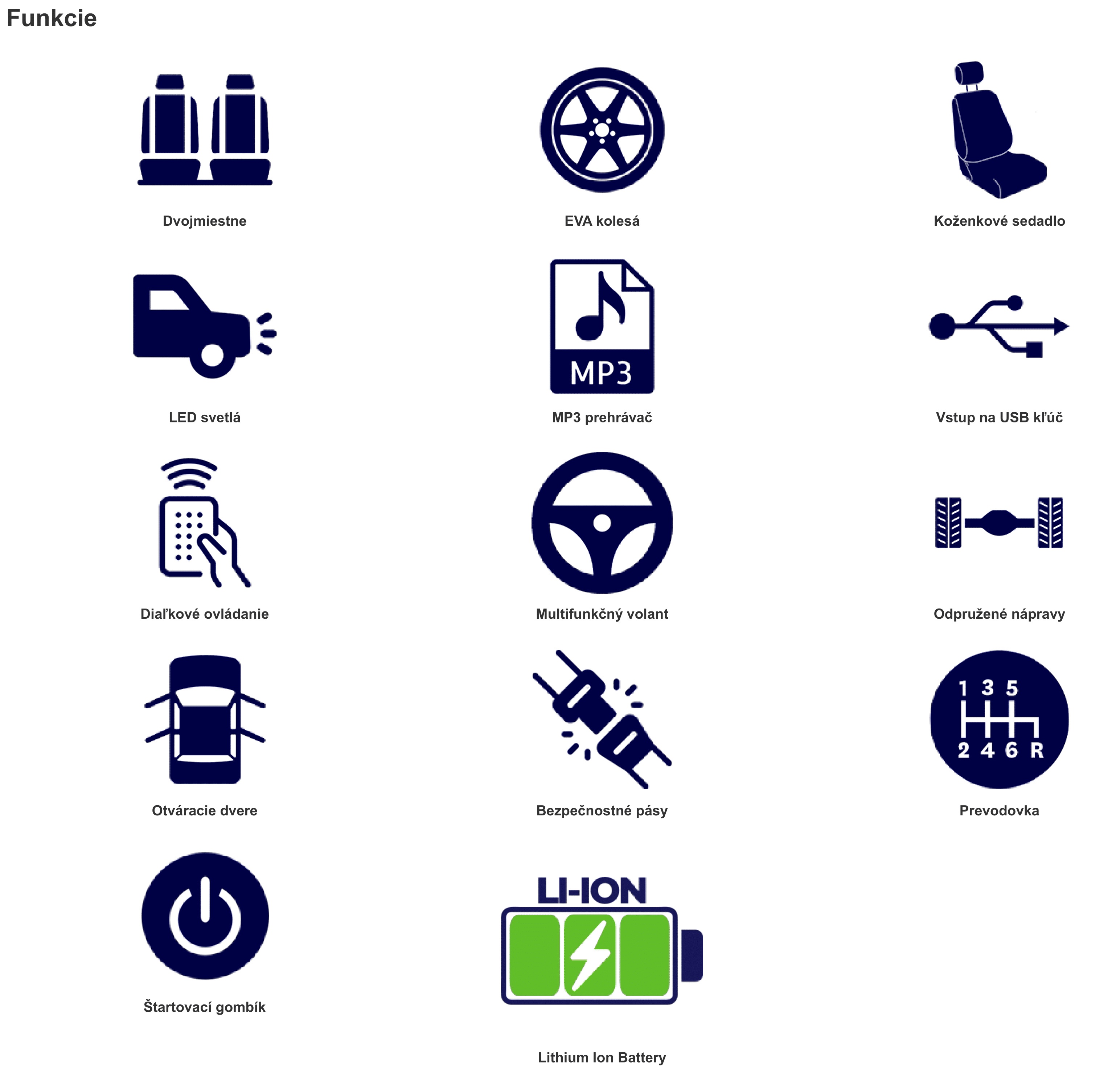 Otváracie dvere, zvukové efekty, indikátor stavu batérie , 2x 200 W motor, s náhonom oboch zadných kolies, 3 rýchlosťami vpred a 1 vzad, vďaka tejto výbave je vhodný aj pre jazdu v teréne.