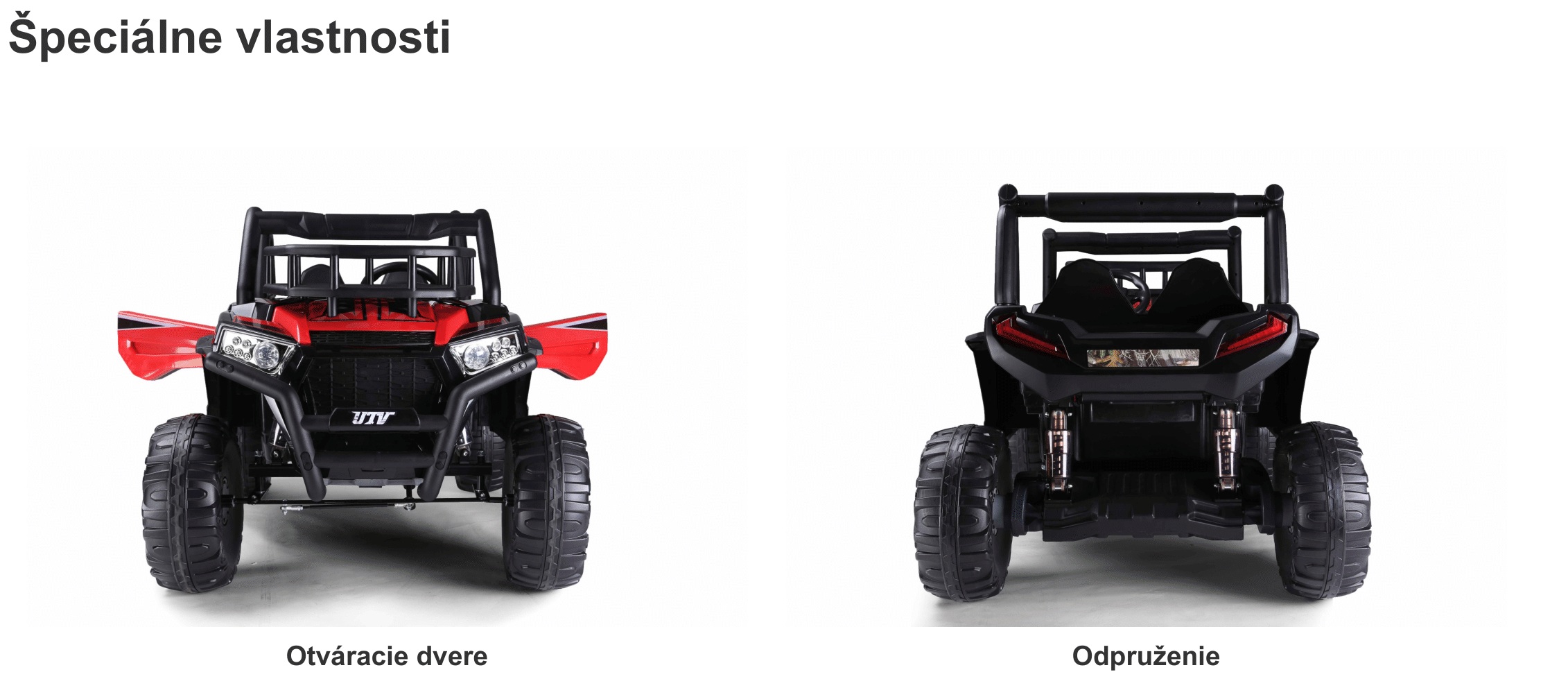 Autíčko UTV má mohutný vzhľad, otváracie dvere, 2 úložné priestory, kvalitné materiály a spracovanie. Má dve koženkové sedačky, čím je vhodný pre dve deti.