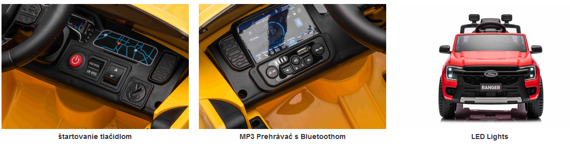 Dokonalé jednomiestne autíčko s luxusným vzhľadom od Fordu. Po zapnutí model imituje zvuk štartovania,zapnú sa LED svetlá. Zvukové efekty ako: klaksón, štart motora, zvuk jazdy, pesničky, melódie, vstup na USB, Bluetooth pripojenie nechýbajú z výbavy. Hlasitosť všetkých zvukových efektov sa ovláda integrovaným MP3 prehrávačom.