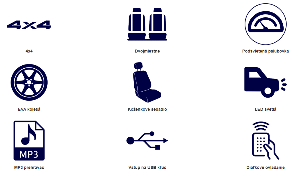 Otváracie dvere, zvukové efekty, indikátor stavu kapacity batérie na MP3 Prehrávači, 2 rýchlosti vpred a 1 vzad, LED svetlá a diaľkový ovládač tiež nechýbajú z výbavy. Detailné vypracovanie a kvalitné spracovanie je dôkazom výnimočnosti modelu G 4x4².