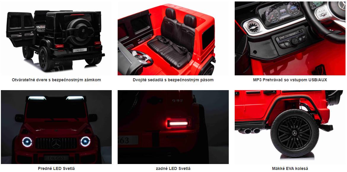 Autíčko Mercedes G63 s vyvýšeným podvozkom je najnovší modelový typ ozaj vhodný aj do terénu vďaka veľkým kolesám a nezávislému odpruženiu. Je vybavený MP3 prehrávačom so vstupom USB/AUX pre prehrávanie vlastných médií a zvukových efektov, multifunkčným volantom a pohodlnými sedadlami vhodné pre dve deti. Pohon zabezpečujú štyri 35W motory s batériou 12V/14Ah.