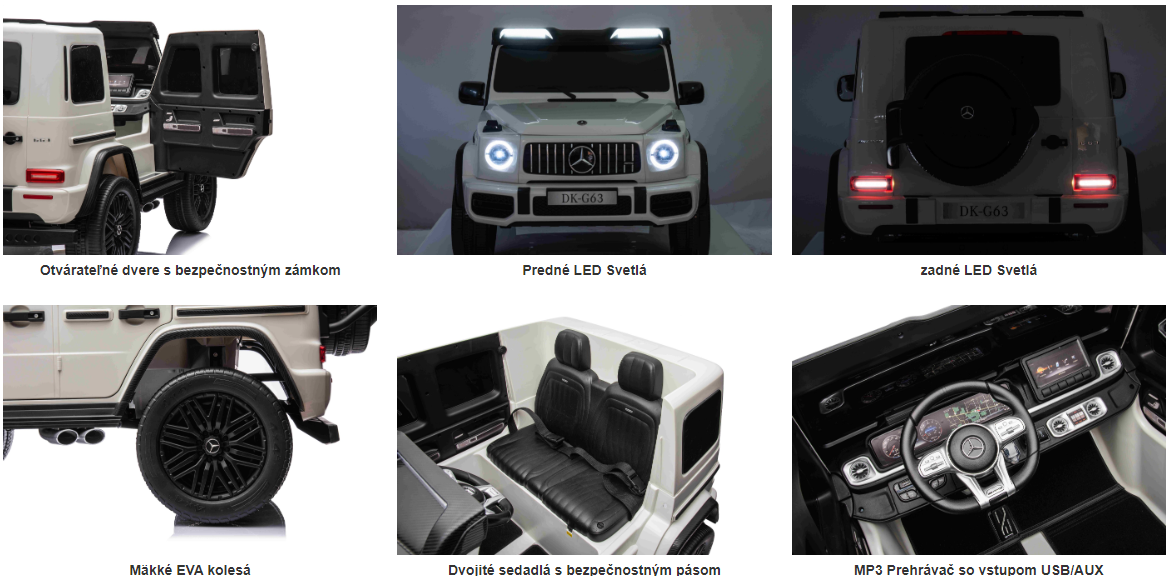 Autíčko Mercedes G63 s vyvýšeným podvozkom je najnovší modelový typ ozaj vhodný aj do terénu vďaka veľkým kolesám a nezávislému odpruženiu. Je vybavený MP3 prehrávačom so vstupom USB/AUX pre prehrávanie vlastných médií a zvukových efektov, multifunkčným volantom a pohodlnými sedadlami vhodné pre dve deti. Pohon zabezpečujú štyri 35W motory s batériou 12V/14Ah.
