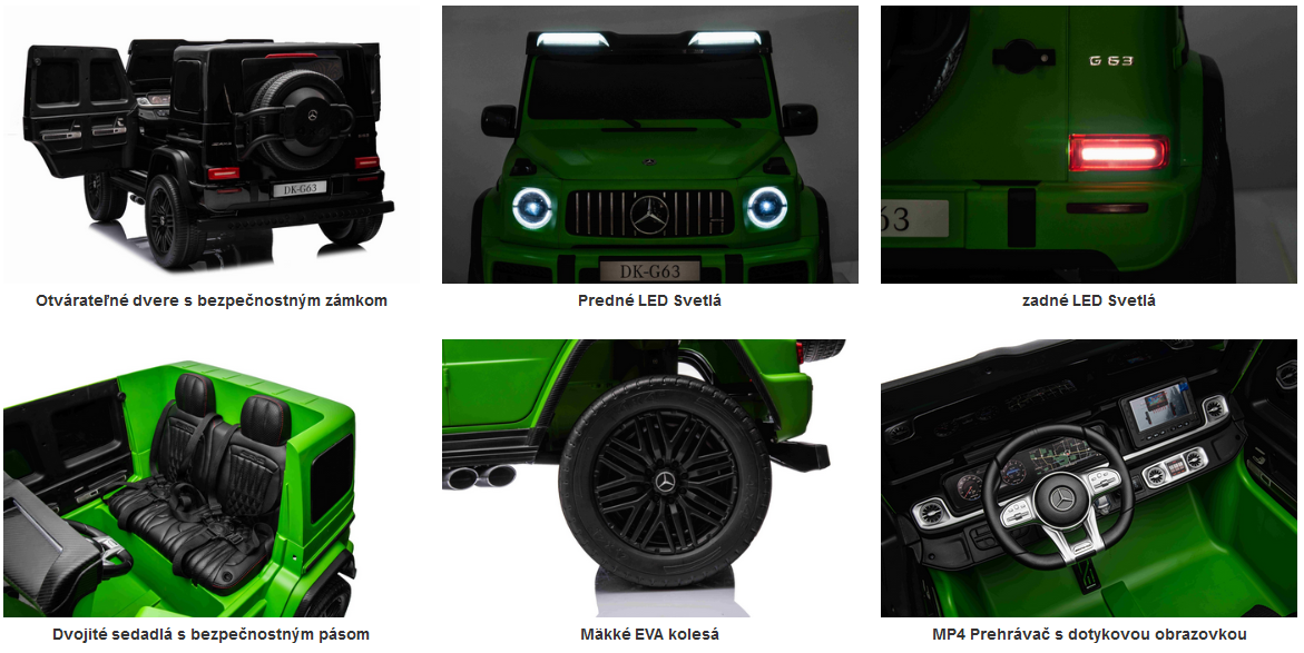 Autíčko Mercedes G63 s vyvýšeným podvozkom je najnovší modelový typ ozaj vhodný aj do terénu vďaka veľkým kolesám a odpruženiu na zadnej náprave. Je vybavený MP4 prehrávačom so vstupom USB/AUX pre prehrávanie vlastných médií a zvukových efektov, multifunkčným volantom a pohodlnými sedadlami vhodné pre dve deti. Pohon zabezpečujú štyri 200W motory s batériou 24V/7Ah.