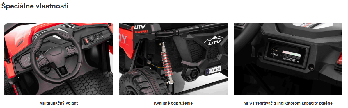 O pohodlie a bezpečnosť sa stará nastaviteľný bezpečnostný pás. Otváracia kapota zvyšuje herný zážitok a na palubnej doske nájdete aj indikátor stavu batérie, ktorý vás upozorní, keď je čas dobiť.