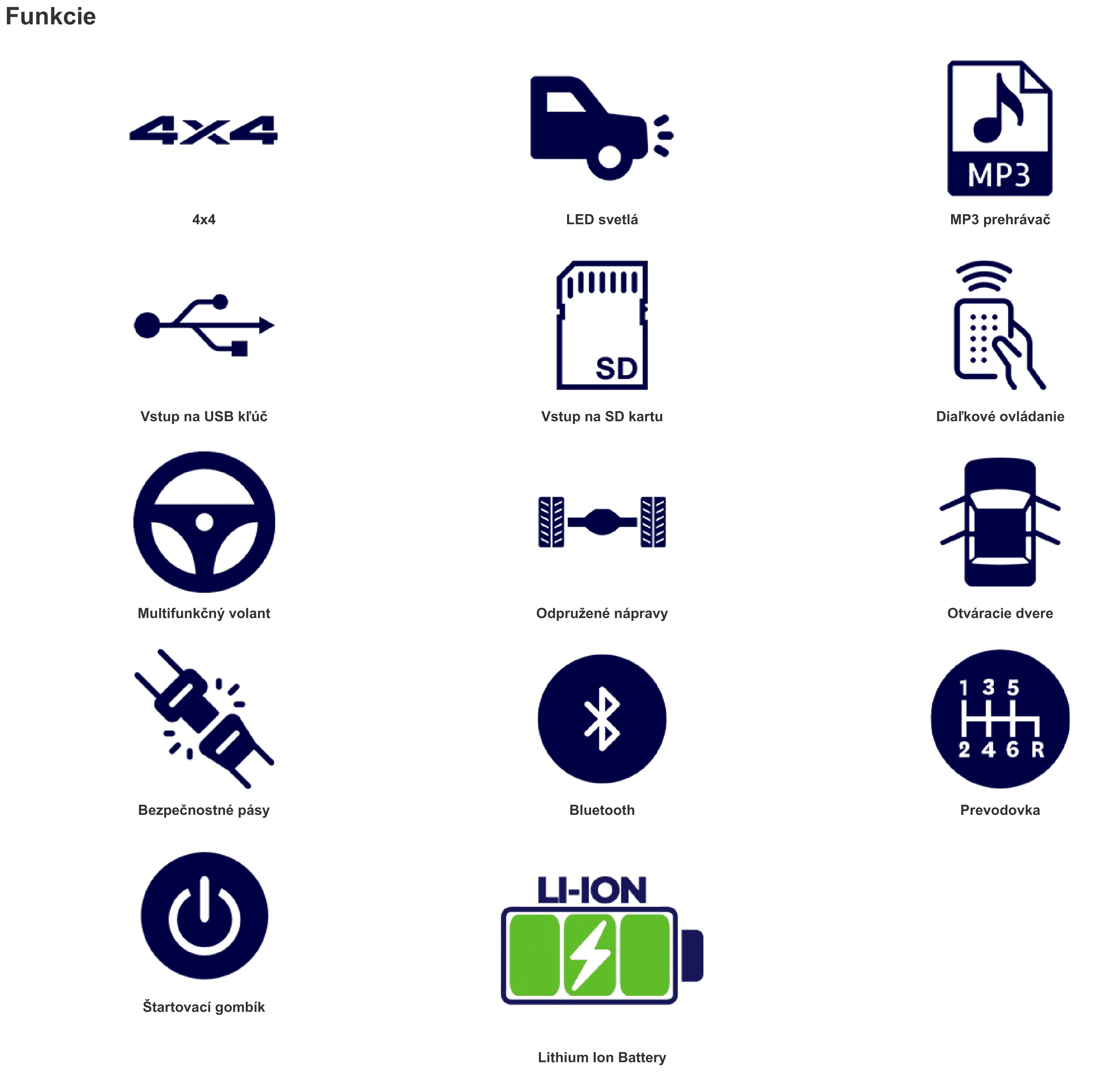 Autíčko je vybavené svietiacimi svetlami a inovovanou audio jednotkou s modernou hudbou a vstupom USB/AUX a BLUETOOTH pripojením. Pre bezpečnosť dieťaťa je na sedačke nastaviteľný bezpečnostný pás pre dve deti.