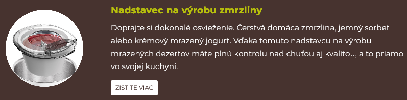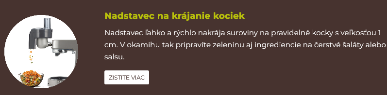 Kúpte si vybraný kuchynský robot Kenwood z radu Chef u vybraných predajcov a získajte po registrácii zadarmo príslušenstvo podľa vlastného výberu. Vyberte si jedno zo 4 možných príslušenstva! Či už je to nadstavec na krájanie kociek, odšťavovač, nadstavec na výrobu zmrzliny alebo sada na zdobenie tort. Váš šikovný pomocník si zaslúži šikovné príslušenstvo.