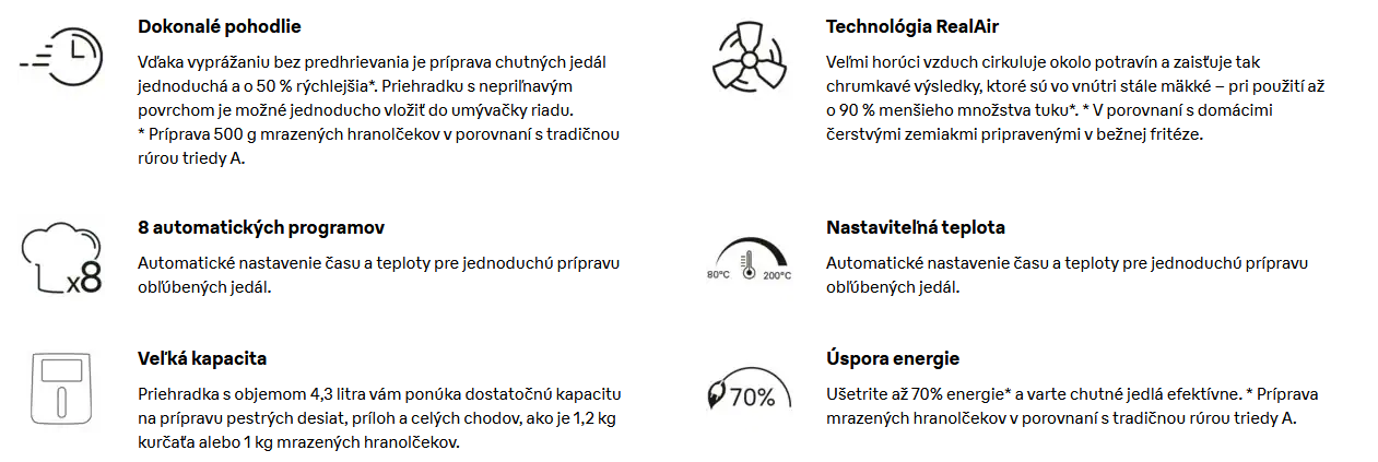 ** Príprava 500 g mrazených hranolčekov v porovnaní s tradičnou rúrou triedy A.
