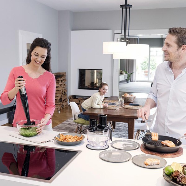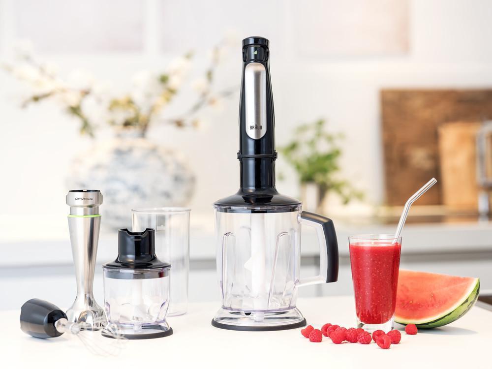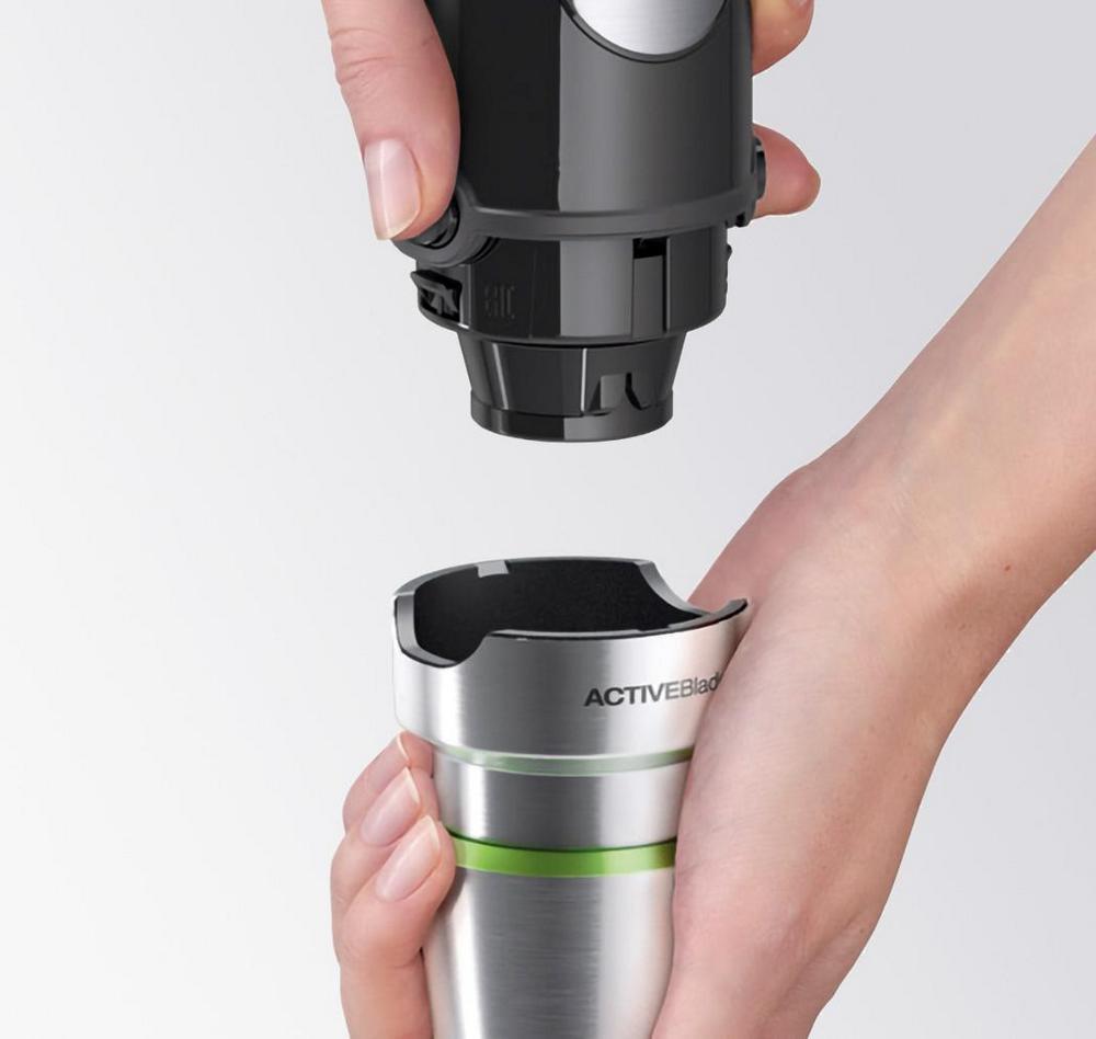 Výkonný ponorný mixér MultiQuick 7 je teraz ešte rýchlejší a silnejší. Kombinácia silného 1000W motora a unikátnej technológie ActiveBlade s pohyblivou mixovacou nohou a PowerBell Plus s extra mlecou čepeľou vám umožní rýchlo a bez námahy rozmixovať i tie najtvrdšie suroviny. Jednoducho, čím silnejšie stlačíte, tým väčšiu rýchlosť získate. Mixujte bez neporiadku s technológiou PowerBell Plus a SplashControl a upustite uzdu svojej kuchárskej fantázií so širokou ponukou príslušenstva. MultiQuick 7, viacej než len ponorný tyčový mixér.