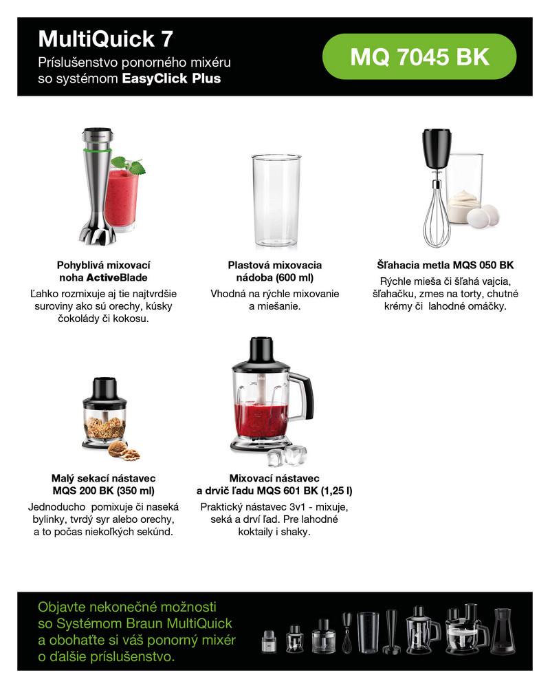 ![]() | Popustite uzdu svojej fantázií s najširšou ponukou príslušenstva na svete Predstavujeme vám Braun MultiQuick Sytém s najširšou ponukou príslušenstva na svete. Ponorný mixér Braun je viacej len ako ponorný mixér. Mixuje, seká, drví, šľahá, krája, strúha, hnetie, pasíruje, melie, pripraví hranolky a rezance, a taktiež krája na kocky. Pozrite sa aké príslušenstvo ponúka práve tento pomocník. Chcete viacej? Vybrané príslušenstvo EasyClick Plus je možné taktiež odkúpiť samostatne, presne podľa toho, čo ku svojím kuchárskym kreáciám potrebujete. Akékoľvek príslušenstvo je možné rozobrať a nechať pohodlne umyť v umývačke riadu. Súčasne sú všetky časti príslušenstva, ktoré prichádzajú do kontaktu so surovinami, bez BPA. |