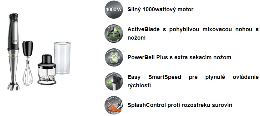 ![]() | SplashControl proti fŕkaniu surovín Všetky ponorné tyčové mixéry Braun MultiQuick ponúkajú taktiež technológiu SplashControl, ktorá vďaka unikátnemu tvaru zvona, otočeného proti smeru pohybu nožov, zabraňuje "hurikánovému efektu". Tekutina sa pri mixovaní nedostane von z nádoby. Užite si mixovanie bez neporiadku v kuchyni. |