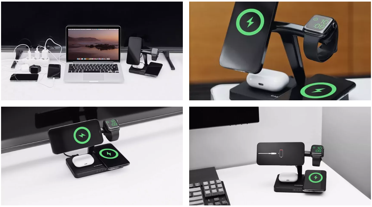 Táto bezdrôtová nabíjacia stanica vám umožní rýchlo a bezpečne nabiť vaše zariadenia a zbaviť sa nepotrebných káblov na vašom pracovnom stole. Môžete nabíjať 4 zariadenia súčasne, vrátane 2 smartfónov, z toho jeden cez magnetický bezdrôtový modul. Vďaka inteligentnému čipsetu ''Bland'' bude každému zariadeniu priradená optimálna kapacita nabíjania. V dôsledku toho sa batérie zariadenia neprehrievajú, čo znamená, že vydržia oveľa dlhšie. Stanica je kompatibilná s akýmkoľvek smartfónom a slúchadlami, ktoré podporujú štandard Qi. Môžete tiež nabíjať inteligentné hodinky Apple Watch Series od 2 do 7. Vynikajúca technologická vychytávka pre tých, ktorí milujú poriadok a oceňujú minimalizmus!