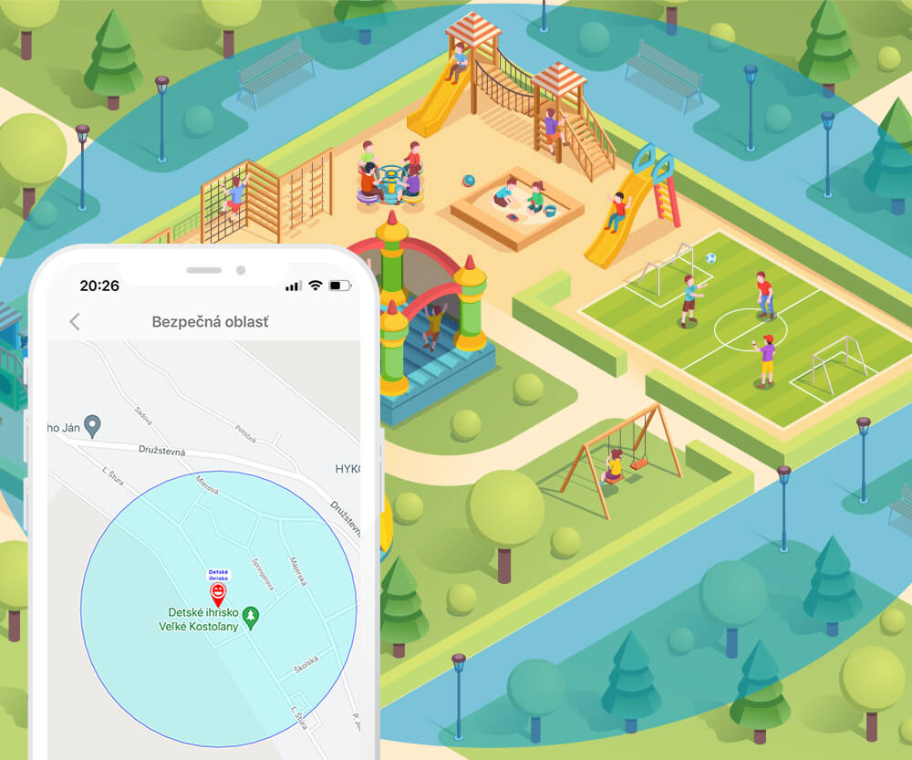 Umožňuje nastaviť lokality, ktoré sú pre vaše dieťa bezpečné. Pri opustení bezpečnej zóny dostanete upozornenie. Môžete si vytvoriť viac bezpečných zón – miesta, ktoré pravidelne navštevuje ako škola, krúžky, ihriská a byť tak informovaný pri ich opustení.