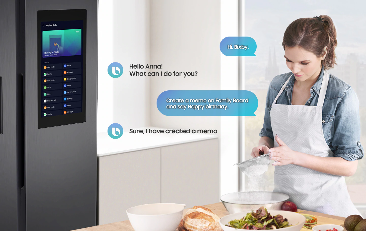 Majte prehľad o dôležitých informáciách. Ranný súhrn vám zobrazí správy, predpoveď počasia, upozornenie na trvanlivosť potravín a váš kalendár na obrazovke chladničky v nastavenom čase alebo keď ju otvoríte. Pokiaľ použijete funkciu rozpoznania hlasu nového asistenta Bixby, chladnička identifikuje, kto hovorí a zobrazí dotyčnému relevantné informácie.