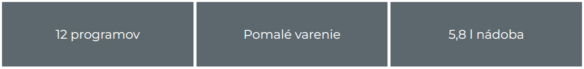 12 prednastavených programov (polievka, mäso, fazuľa, hydina, ryža, zelenina, kaša, para, dusenie, restovanie, jogurt, pomalé varenie) + manuálny režim DIY