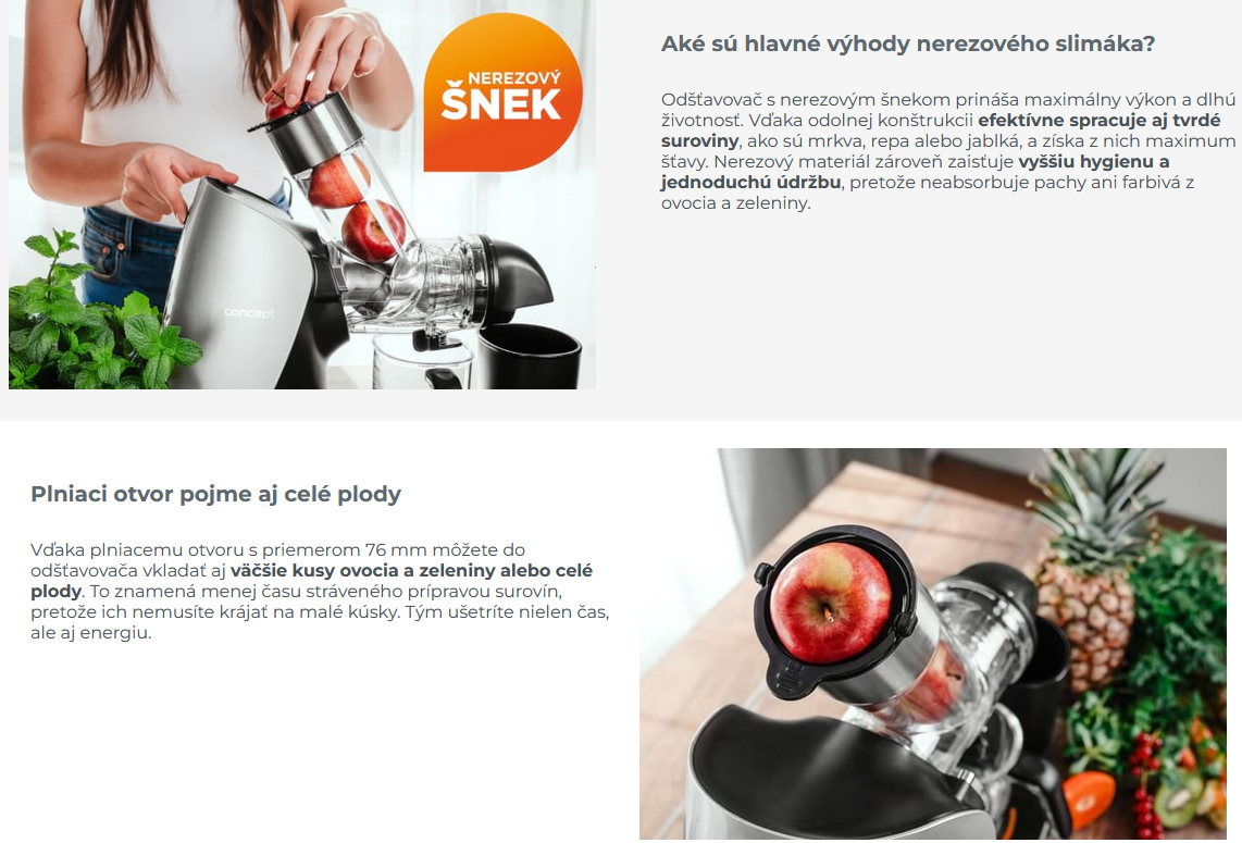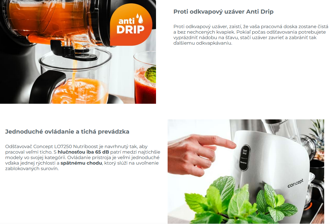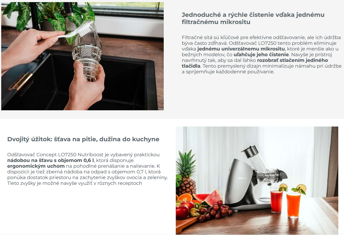 Pokiaľ si radi doprajete pohár čerstvej šťavy z ovocia alebo zeleniny, šnekový odšťavovač Concept LO7250 Nutriboost je pre vás ideálnou voľbou. Pomalý proces odšťavovania v kombinácii s horizontálnou polohou hriadeľa a vysoko kvalitným nerezovým šnekom zaistí efektívne spracovanie ovocia, zeleniny i bylín s maximálnou výťažnosťou šťavy a minimom odpadu. Nízkootáčkový systém zaisťuje šetrné odšťavovanie, ktoré zachováva cenné vitamíny, enzýmy a prirodzenú chuť surovín.