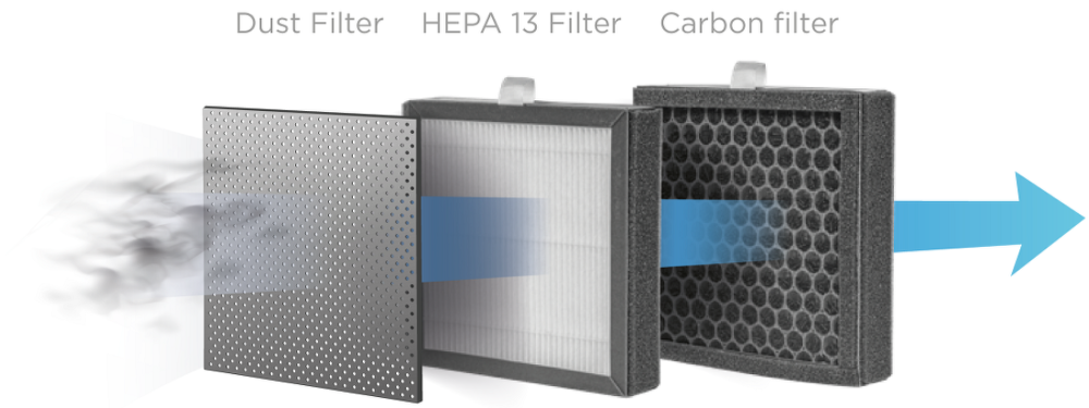 Súčasťou odvlhčovača je aj čistička vzduchu vybavená trojnásobným filtračným systémom, ktorý zachytí škodlivé látky obsiahnuté vo vzduchu a zamedzí ich ďalšiemu šíreniu. Každá jednotlivá filtračná vrstva zadrží špecifické druhy nečistôt a pohltí až 99% škodlivín obsiahnutých vo vzduchu a prispejú k čistejšiemu ovzdušia vo vašej domácnosti.
