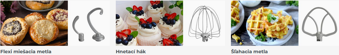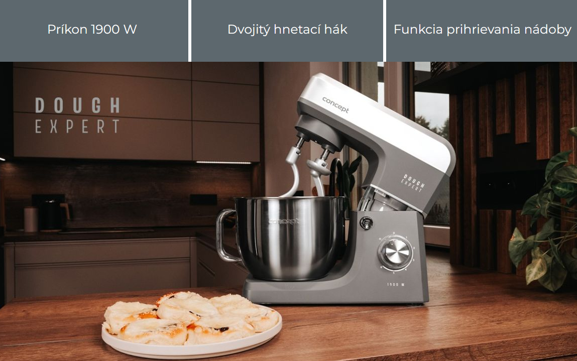 | Funkcie: | špecialista na kysnuté cestá, funkcia prihrievania nádoby, okrem dvojitého hnetacieho háku je vybavený šľahacou a miešacou metlou. |