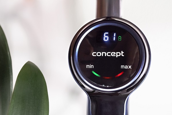 Dobíjacia Li-Ion batéria s kapacitou 2200 mAh dodáva vysávaču maximálnu voľnosť pohybu. Vyberať môžete z troch režimov. Po spustení pracuje na najnižšom výkone, ktorý je vhodný na bežné upratovanie tvrdých podláh. Sacia sila dosahuje 10 kPa a výdrž na jedno nabitie až 40 minút. Na koberce a silne znečistené povrchy odporúčame používať maximálny výkon so sacou silou 20 kPa, pri ktorom je však nutné počítať s kratšou prevádzkovou dobou. Na digitálnom displeji vidíte zvolený režim aj aktuálny stav batérie v percentách. Nechýba ani indikátor plnej prachovej nádoby a zaseknutej kefy.