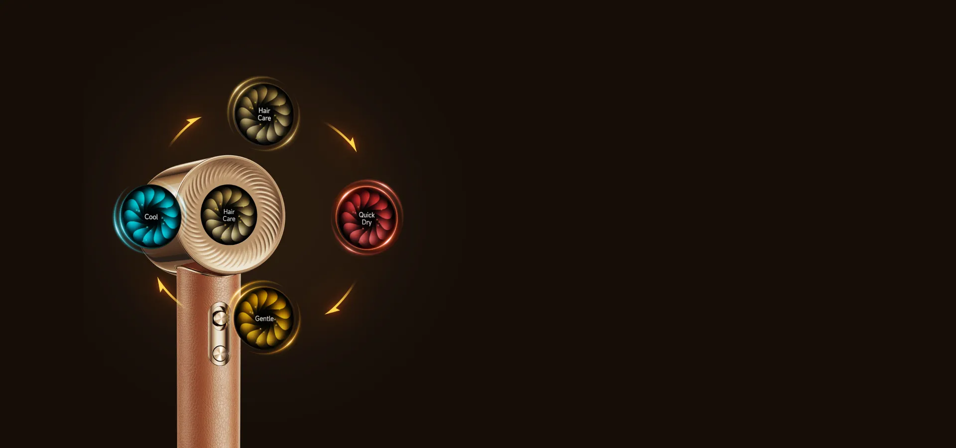 Vďaka štyrom teplotným nastaveniam si môžete fén prispôsobiť svojim potrebám a vlasy ľahko vysušiť. Režim studeného vzduchu umožňuje sušiť vlasy pri nízkych teplotách v horúcich letných dňoch. Pre rýchle sušenie v chladnom počasí odporúčame režim teplého vzduchu. Jemný režim zaisťuje rovnomernú teplotu. Režim starostlivosti o vlasy sa o vaše vlasy stará obzvlášť jemne.