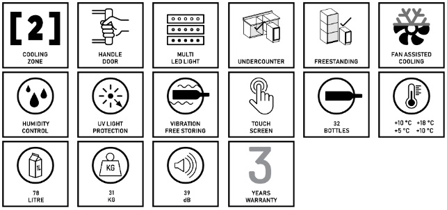 Energetická trieda: G • Hlučnosť: 39 dB • Rozmery - výška: 82 cm • Spotreba energie: 125 kWh • Max. počet fliaš: 32