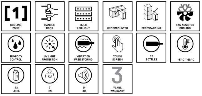 Energetická trieda: F • Hlučnosť: 39 dB • Rozmery - výška: 82 cm • Spotreba energie: 100 kWh • Max. počet fliaš: 32