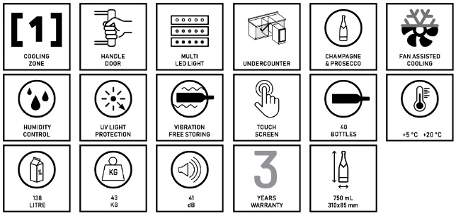 Energetická trieda: E • Hlučnosť: 38 dB • Rozmery - výška: 81.3 cm • Spotreba energie: 83 kWh • Max. počet fliaš: 40