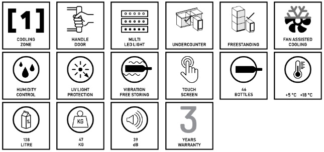 Energetická trieda: G • Hlučnosť: 39 dB • Rozmery - výška: 82 cm • Spotreba energie: 130 kWh • Max. počet fliaš: 46