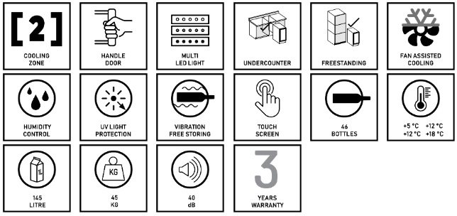 Energetická trieda: G • Hlučnosť: 40 dB • Rozmery - výška: 82 cm • Spotreba energie: 155 kWh • Max. počet fliaš: 46