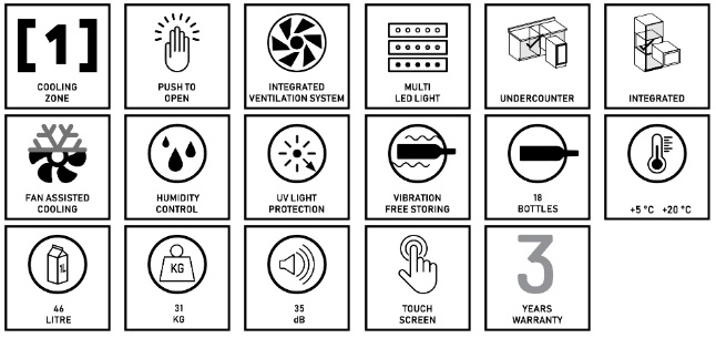 Dunavox DAVG-18.46 je jednozónová vstavaná kompresorová vinotéka, ktorej elegantný vzhľad ju predurčuje na použitie v moderných kuchyniach. Tónované sklo aj push-to-open technológia otvárania dvierok z nej robia ozvlášť reprezentatívny model. Dvere vinotéky sa otvárajú zatlačením do ľavého horného rohu. Model disponuje kapacitou až 18 fliaš vína.