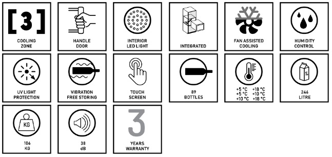 Energetická trieda: G • Hlučnosť: 38 dB • Rozmery - výška: 178.6 cm • Spotreba energie: 162 kWh • Max. počet fliaš: 89