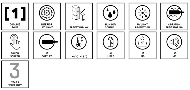Dunavox DXFH-16.46 je voľne stojaca jednozónová vinotéka s kapacitou až 16 fliaš. Vďaka svojmu elegantnému čiernemu vzhľadu je vhodná ako pre domácnosti, tak aj pre umiestnenie v reštauráciach. Fľaše sa ukladajú na masívne drevené police. Možnosť uskladnenia otvorenej fľaše nastojato. Vnútorná teplota sa nastavuje na digitálnom ovládacom paneli.
