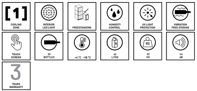 Dunavox DXFH-20.62 je voľne stojaca jednozónová vinotéka s kapacitou až 20 fliaš. Vďaka svojmu elegantnému čiernemu vzhľadu je vhodná ako pre domácnosti, tak aj pre umiestnenie v reštauráciach. Fľaše sa ukladajú na masívne drevené police. Možnosť uskladnenia otvorenej fľaše nastojato. Vnútorná teplota sa nastavuje na digitálnom ovládacom paneli.