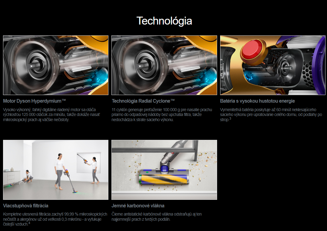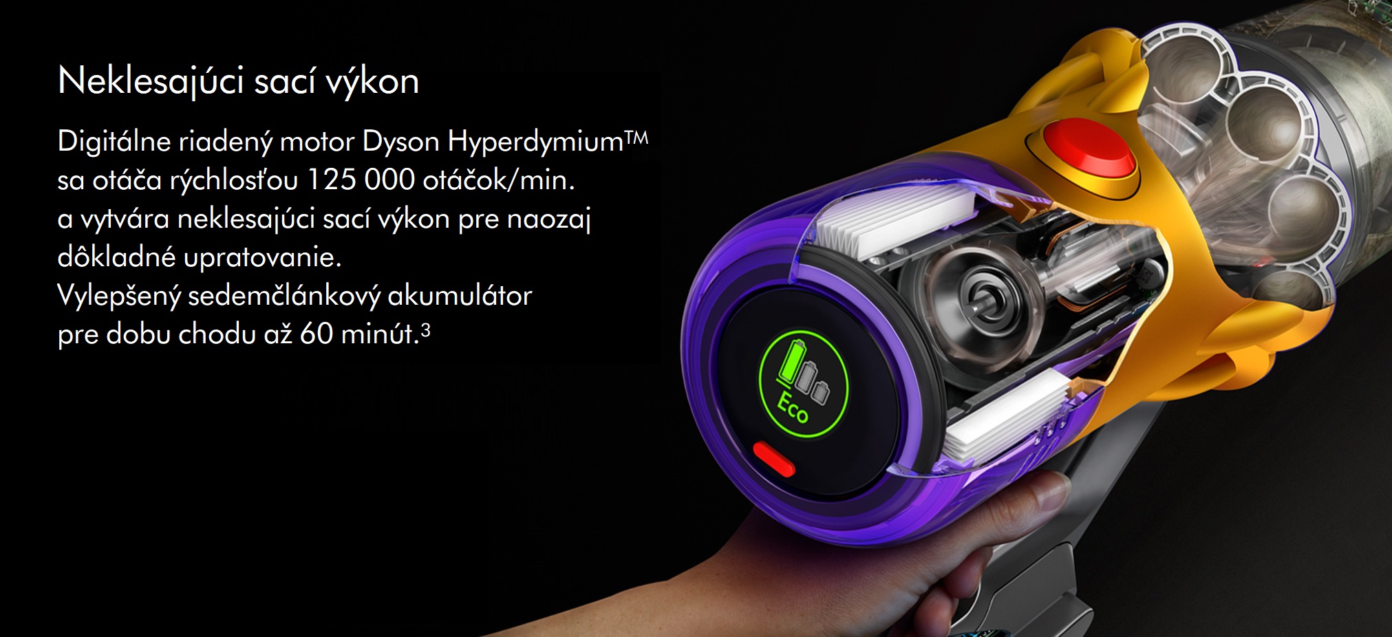 Vysoko výkonný, ľahký digitálne riadený motor dosahujúci až 125 000 otáčok za minútu, aby dokonale vysial mikroskopický prach aj veľké nečistoty.