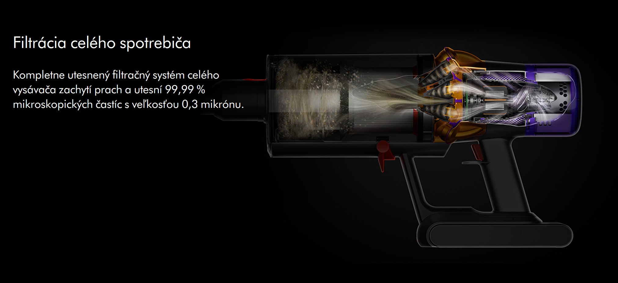 Plne utesnený systém filtrácie Dyson zachytí 99,99 % mikroskopických častíc a alergénov už od veľkosti 0,3 mikrónu - a vypúšťa čistejší vzduch.