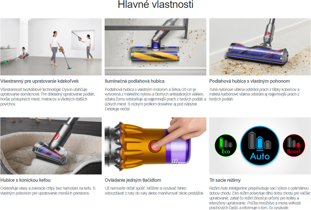 Režim Auto inteligentne prispôsobuje sací výkon s optimálnym vyvážením výkonu a doby chodu. Režim Eko poskytuje dlhšiu dobu chodu pre väčšie upratovanie, zatiaľ čo najvyšší režim Boost je navrhnutý pre krátke a intenzívne upratovanie.
