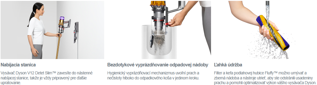 Filter a mäkký valček Iluminačnej podlahovej hubice sa dajú umývať, zberná nádoba a nástavce sa dajú otrieť handričkou, aby sa odstránil nahromadený prach a optimalizovala sa výkonnosť vášho vysávača Dyson.