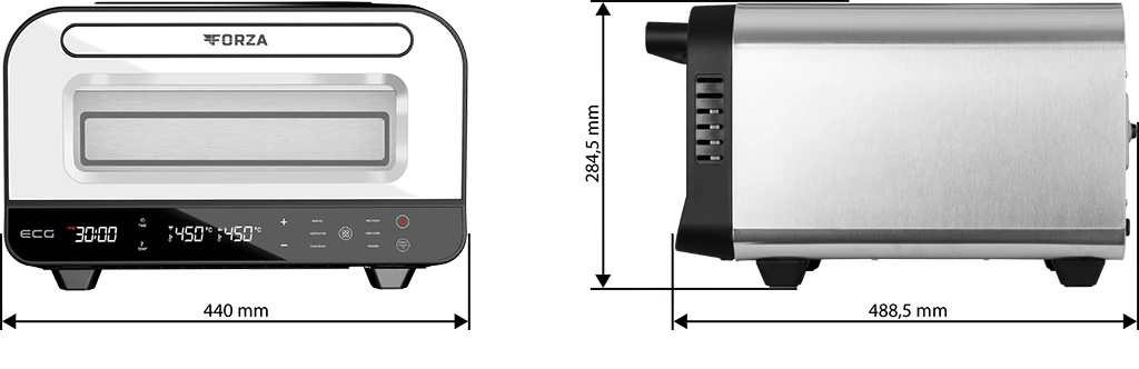 Rozmery 488,5 × 440 × 284,5 mm nahrávajú tomu, že môžete pec ECG FORZA 4500 Pizza pohodlne usadiť na štandardnú kuchynskú linku alebo si ju vziať napríklad na chatu. Či už ale chystáte rýchlu večeru, alebo organizujete rodinnú oslavu, dostatočne veľká plocha kameňa na pečenie (320 × 320 mm) vám umožní pripraviť skvelú pizzu pre všetkých prítomných. Pec pracuje s príkonom 1600–1850 W a pripája sa do klasickej zásuvky (menovité napätie 220–240 V). Dĺžka prívodného kábla je pritom dostatočných 90 cm. Za chodu spotrebič generuje hluk pod 65 dB, teda večerné pečenie nie je nijako rušivé ani v panelovom dome plnom ľudí.