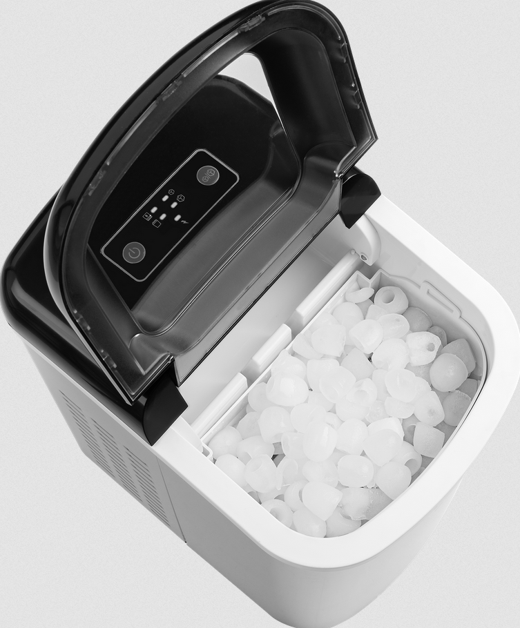 Vstupná nádoba nášho výrobníka ľadu pojme až 1,9 litra vody, kapacita zásobníka na hotový ľad je 0,7 litra. Praktické sú pritom aj vstavané indikátory, ktoré vás v prípade potreby upozornia, že je v prístroji nedostatok vody alebo ak je nádoba na ľad plná.