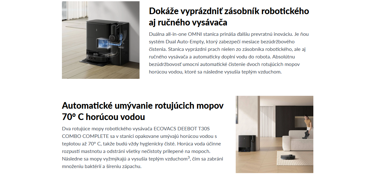 - Duálna all-in-one OMNI stanica umýva rotujúce mopy 70° C vodou, vyžmýka ich a vysuší teplým vzduchom. Zároveň automaticky vyprázdni prach zo zásobníka ručného/tyčového a robotického vysávača, ktorému zároveň doplní vodu.