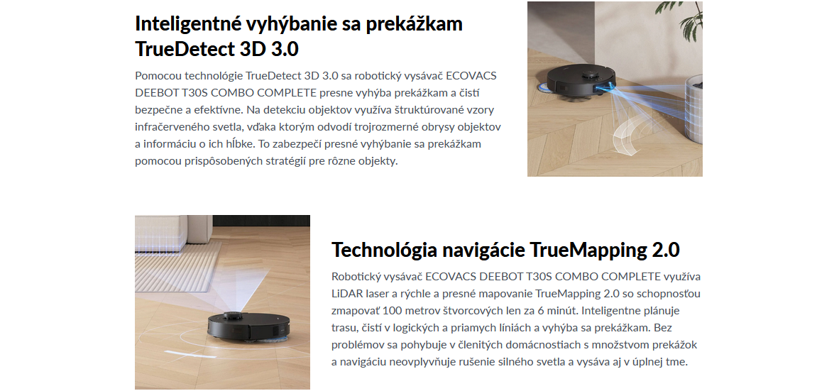 - Vďaka technológii TrueDetect 3D 3.0 sa inteligentne a presne vyhýba prekážkam na podlahe.